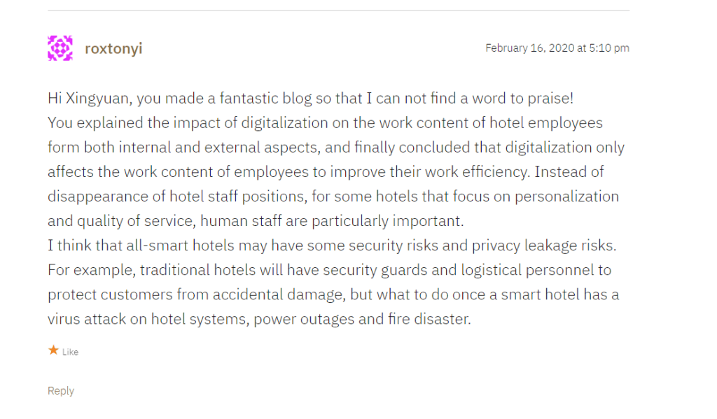 For example, before making comment 1, I have to search and read some references about sharing economy. After that I come up a question about which kind of idle resources can be shared. Emma’s second blog show me how the digital economy affects the role of hotel staff with three type of forms, which give me a better idea related to how to blog in multiple forms. Antish’s third blog let me getting better understanding of digital banking. Finally, I find that there is a different understanding of the way to show the relationship between digital business model and company success when I read the third blog of Emma. I analysed and reconstructed her blog in my own way when I commented on this blog.